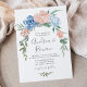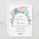 Romántica invitación a la boda con una flor garland de polvorientos azules y rosados.