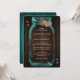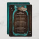 Invitación rústica a la boda verde azulada con un frasco de albañil y corazones de arpillera sobre un fondo de madera de granero.