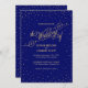 Pequeñas estrellas doradas purpurinoso brillan en nubes confetti alrededor del borde de esta bella invitación a una boda azul marino, con un guión con efecto purpurina dorado que dice "el Boda de". Agradable, moda y encantadora. Perfecto para un boda nocturno bajo las estrellas. Obra de arte original de Colleen Michele. Por favor, tenga en cuenta que no hay un efecto real de purpurina de oro o hoja de oro en las estrellas y el guión; en esta invitación no se utilizará ningún purpurina, hoja de oro o tinta metálica.