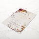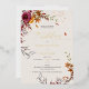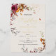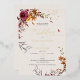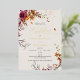 Celebra tu día de bodas con este elegante juego de invitaciones de boda floral de otoño. El diseño presenta un bonito conjunto de ricas flores otoñales en tonos de burdeos, dorados y rubor, acentuadas por una delicada vegetación. En la parte delantera se muestran los nombres y los detalles de los bodas enmarcados por el diseño floral, mientras que en la parte trasera se continúa con el motivo de un aspecto coherente e impresionante. Perfecto para bodas de otoño, este conjunto de invitaciones combina el encanto de temporada con la elegancia sofisticada, lo que lo convierte en una elección ideal para parejas que buscan añadir un toque de belleza natural a su día especial.