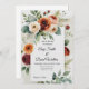 Celebra tu día especial con esta impresionante invitación rústica a la boda, que incluye un ramo de flores de acuarela de óxido rico, naranja quemado, rosa rubor y crema, acentuado por un follaje verde y delicados detalles botánicos. El diseño ofrece un espacio en blanco generoso para el texto de tu boda personalizado, lo que lo hace perfecto para celebraciones de otoño, temas de moda boho o elegantes bodas de campo. Impreso con detalles de alta calidad, esta invitación le da un tono cálido y romántico a su gran día.