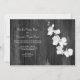 Invitación a la boda con una imagen en blanco y negro de fondo de orquídeas blancas sobre madera de pino. Personaliza con detalles de tu ocasión a la izquierda. La palabra es de novia y novio.