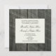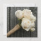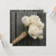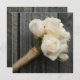 Invitación a la boda con una foto de un ramo de rosas blancas con tallos envueltos en un tubérculo sobre un fondo de madera de pino. Personalice con detalles de su ocasión en el lado opuesto, que también presenta fondo de madera de pino.