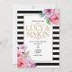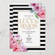 Hermosos florales rosados sobre rayas blancas y negras. En este diseño se pueden personalizar los colores, estilos y tamaño del texto. Las invitaciones y las tarjetas están disponibles en una selección de texturas y formas de papel (borde redondeado, vieira, etc.) Puede encontrar otros diseños con muchos productos de coordinación en la tienda, incluyendo invitaciones, guardar la fecha y las tarjetas rsvp, etiquetas de agradecimiento y más.