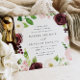 Nuestra invitación a una boda Rubor Romance con forma cuadrada rodea los detalles de tu día de boda con una corona de flores acuáticas en marfil, marsala de color burdeos y rosa rubí, acentuada con hojas botánicas verdes y follaje.