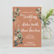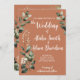 Invitaciones a bodas con hojas florales de salvia de color agua, flores de marfil y rubor sobre un fondo de terracota.