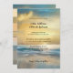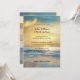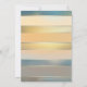 Invitación a la boda con un original cuadro de arte de una puesta de sol en la playa. La parte trasera muestra un diseño rayado de colores soñados.
