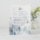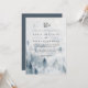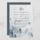 Elegante invitación a bodas de invierno con un fondo de acuarela que representa un paisaje montañoso nevado salpicado de pinos en tonos brumosos de azul y gris. Personalice los detalles de su boda en moda con letras blandas de color negro, coronadas por su monograma o duograma y unidas por un marcador de escritura decorativo. Una hermosa elección para elegantes bodas de invierno en ambientes montañosos o forestales.