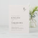 Esta invitación a la boda muestra un diseño elegante y formal, perfecto para una ceremonia sofisticada. La invitación presenta una estética minimalista, con líneas depuradas y un enfoque en la tipografía. Los nombres se muestran de forma prominente en una fuente serif clásica, lo que da un aire de gracia eterna a la pieza. El uso de una simple ampersand o "to" entre los nombres añade un toque de simplicidad moderna. El texto está bien organizado sobre un fondo de papel texturizado, lo que mejora el aspecto formal general. En la parte inferior de la invitación se incluye un guión con estilo característico, que indica un toque personal. Esta plantilla, para un boda en un jardín botánico, combina la tradición con la elegancia contemporánea, lo que la convierte en una elección ideal para parejas que buscan una invitación refinada y elegante.