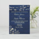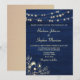Elegante, moderno, rústico, de madera granero, invitación a una boda azul marino con encaje floral dorado, luces de cuerda y guión moderno de caligrafía. ¡Una elección perfecta para bodas de otoño o de invierno!