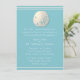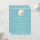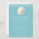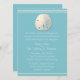 Bonita invitación a bodas de temática playera en azul turquesa, con gráficos de un dólar de arena marfil, en las rayas superiores y marfil, en la parte superior e inferior. Personalice el texto en blanco para que se ajuste a sus necesidades. Se ofrecen productos de boda de Sand Dollar a juego.