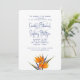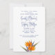 Ave de invitaciones nupciales paradisíacas con diseño de flores exóticas y naranjas. Texto azul oscuro con fuentes modernas impresas en papel blanco y vertical. Un gran "y signo" sostiene los nombres. Personalizar para incluir un sitio web boda, responder en línea o añadir información de recepción. Este diseño también viene como descarga instantánea.