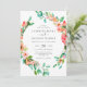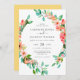 Esta invitación a bodas florales tropicales incluye una corona floral de color bonito con flores tropicales, follaje exuberante y conchas marinas. La flor floral incluye hibiscos y flores de plumería en tonos melocotón, rosa coral y rosa rubor. Las hojas verde esmeralda y verde azuladas también decoran la corona acuarela. La parte trasera de la tarjeta es un bonito amarillo solárium. En nuestra colección de bodas Tropical Floral encontrará artículos de papelería boda coincidentes.
