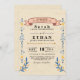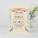 Invitación a la boda floral El diseño presenta una corona de flores de color acuático y más en tonos azul marino, verde y marfil. Diseño de texto. En la parte posterior se ha colocado una disposición floral que combina con el conjunto.