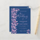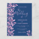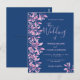 Una invitación a la boda floral y a la moda en azul y rosa Un fondo azul moderno decorado con estribos y follaje de color rosa botánico. Guión moderno de gran tamaño con letra, tipografía con el texto: El boda de. Personalice y agregue sus nombres y detalles del boda. Texto rosado. Fondo azul.