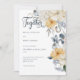 Este bonito diseño está decorado con flores polvorientas azules, amarillas pálidas y blancas sobre un fondo blanco. Esta tarjeta es parte de la suite Boda floral azul, amarillo y blanco de tarjetas creada por Simply Farmhouse Press.