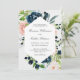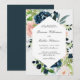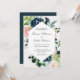 Una bella invitación a la boda en un popular esquema de color rosa y azul de medianoche, esta invitación marca el tono para una celebración encantadora. Bonitos ramos de rosas acuáticos y flores mixtas de color rosa y azul medianoche con vegetación y elementos esbozados rodean el único marco geométrico hexagonal. El esquema de colores funciona bien en los bodas durante cualquier temporada del año. Personalice el texto con los detalles de su boda.