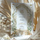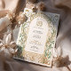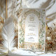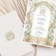Sumérjase en la elegancia de una época pasada con esta exquisita suite de invitaciones a la boda floral de estilo Art Nouveau. Inspirada en las formas orgánicas del movimiento Art Nouveau, esta invitación es una armoniosa mezcla de naturaleza y diseño. La fachada de la invitación está adornada con un intrincado patrón de flores de lirio y hojas sinuosas en una paleta de blanco suave, verde salvia y oro sutil, ambientada con un fondo crema. En la parte posterior se muestra un emblema monograma entrelazado con un árbol de la vida, que resume la unidad de dos vidas entrelazadas. Los colores verde sabio, dorado y blanco se entremezclan con el diseño, aportando una sofisticación atemporal a la invitación boda.