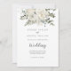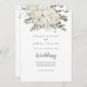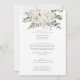 Esta invitación a bodas floridas de invierno y a bodas traseras es perfecta para una elegante boda. El diseño moderno se compone de flores blancas con vegetación de invierno y hojas de eucalipto, con un ambiente rústico sencillo.