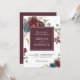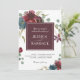 Flores florales de acuarela artesanalmente elegantes en marsala de color rojo profundo, borgoña y marina con ramas de eucalipto y vegetación rayante enmarcan los bordes de esta distintiva invitación a la boda. Un cuadro cuadrado de marsala a juego aporta un agradable telón de fondo a los nombres de los novios. Personalice la plantilla de texto fácil de usar con los detalles de su boda.