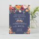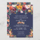 La invitación a la boda coincide con nuestra colección Paprika Burgundy Floral, que presenta una coloración floral de una magnífica paleta de borgoña, oro, coral, verduras frondosas y frondosas que enmarcan los detalles de la invitación a la boda con un fondo azul marino. Todo el texto es completamente personalizable.