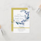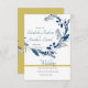 Invitación a la Boda Floral con un tema de oro y azul. la tipografía es de un tipo moderno de azul y negro simple. Una barra de color dorado bajo los puntos de la palabra boda. El reverso de la tarjeta es en un color oro falso con un diseño floral sobre ella. La invitación puede modificarse para incluir la redacción que desea. Además, la dirección y las fechas se modifican fácilmente a través del botón personalizar para reflejar su evento.