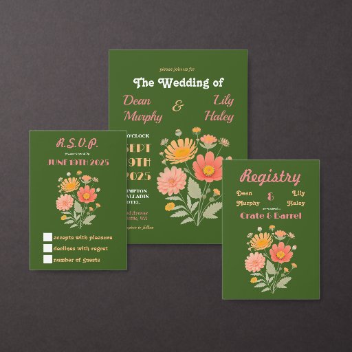 Esta audaz y llamativa invitación a la boda fue creada con una estética retro en mente. Presenta una ráfaga de colores y una tipografía juguetona que capta la atención al instante. Los elementos florales de inspiración vintage aportan un toque de calidez y elegancia al conjunto, lo que lo convierte en una elección perfecta para las parejas que aprecian el encanto nostálgico del pasado.