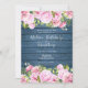Con rosas rosadas en un fondo azul de madera rústica y detalles personalizados de boda en una tipografía elegante. Diseñado por Thisisnotme©