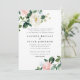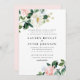 Una clásica invitación a las bodas floridas en color pastel, enmarcada por un ramo de flores pintadas en rosa rosa, blanco y azul polvoriento. Los detalles de su boda se resaltan con todas las letras negras.