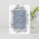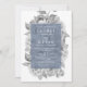 Dramáticamente elegante en tonos negros, blancos y azul de pizarra, nuestra invitación a la boda de Vintage Floral cuenta con un fondo de flores de manteca acuática en blanco y negro moda. Los detalles del boda se muestran en blanco contra un elemento rectangular azul de pizarra. Un diseño moderno y atemporal perfecto para los asuntos formales en cualquier época del año.
