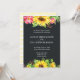 Invitación a la boda girasol con flores amarillas y rosas y hojas verdes sobre un fondo oscuro. Las flores decoran la parte superior e inferior. El fondo de la invitación tiene fondo rayado amarillo pálido.