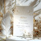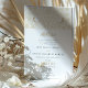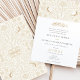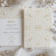 Esta exquisita invitación a la boda combina la intrincada belleza del diseño victoriano con el elegante guion del arte islámico. En la portada se ve un patrón simétrico de flores victorianas en oro, acentuado por un par de aves amorosas, cada una con una inicial de los nombres de la pareja. El interior de la invitación revela una armoniosa mezcla de caligrafía tradicional inglesa y árabe, invitando a los huéspedes a celebrar la unión. Los detalles de la invitación se establecen en un fondo blanco texturado que mejora la legibilidad del texto, mientras que los elementos de diseño dorado resuenan con la riqueza de ambas culturas. Esta invitación es un hermoso testimonio de un boda que abraza la fusión cultural con gracia y estilo.