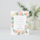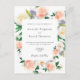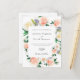 Una invitación floral de bodas a la moda en blanco, coral y melocotón. Un fondo blanco de moda en la parte delantera. Decorada con grandes flores de color agua, flores de color blanco, coral y melocotón. Plantillas para los nombres y detalles del boda. Texto gris oscuro. Atrás: sin color de fondo. Sugerencia: Si no desea que se vea como una postal, haga clic en personalizar, vaya a la parte posterior y quite el separador y el sello postal.
