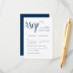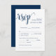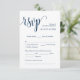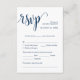 Esta es la hermosa tarjeta de gabinete Moderno, Caligrafía, Romántico RSVP (Respond), en Azul Naval Clásico, donde puedes editarla, cambiarla de color y formatearla según tus necesidades de diseño, con opciones de comida, asientos reservados, número de asistentes y opción de petición de canciones. Teesha Derrick