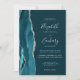 El borde izquierdo de esta elegante y moderna invitación a la boda incluye una verde azulada barra acuática recortada con un falso purpurina de plata. El texto del personalizable combina escritura a mano, copperplate y cursiva en gris plateado sobre un fondo azul verde azulado oscuro. El reverso presenta un diseño de ágata verde azulado y plateado a juego.