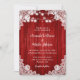 Invitaciones a bodas de moda rústica roja inspiradas en encajes florales blancos y luces de cuerda sobre un fondo de madera. Perfecto diseño de tarjetas para invitar a sus invitados a su romántica fiesta de bodas rústica con arándanos.