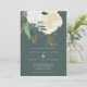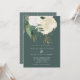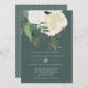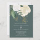 Una invitación de boda moderna y romántica, perfecta para una boda de otoño o de invierno. Este diseño cuenta con una cascada de rosas acuáticos de color blanco y marfil, hojas verdes y un polvo de purpurina falso, sobre un fondo verde sabio oscuro. El reverso también está en verde oscuro sólido.