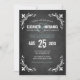 Esta encantadora invitación a bodas vintage presenta un fondo de pizarra, un patrón de esquina de filigranas blancas y una tipografía angustiada. Fácilmente personalizado en línea con su información.