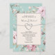 Botánica, elegante, moderna, pastel, acuarela floral de color rosa rosa y polvoriento invitación de boda azul con corazón de cuerda gris plateada y monograma de vuelta.