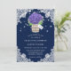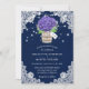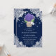 Invitaciones rústicas de bodas moradas y azules con un ramo de bodas con una hortena y un ramo de aliento de bebé dentro de un frasco de albañilería en una burpía y un fondo de encaje floral. Diseño de tarjeta perfecto para invitar a sus invitados a su fiesta de bodas rústico morado y azul inspirado en las flores de horangea. Tarjeta fácil de personalizar.