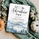Elegantes montañas rústicas de acuarela y la invitación a bodas de la escena forestal, con frondosos árboles azules y verdes y montañas con un texto de guión: que comience la aventura. Para los que aman un romántico y soñador bosque, vivirán por su ceremonia y celebración.