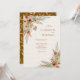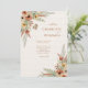 Hermosa plantilla rústica de invitación a la boda con fondo blanco con un arreglo de esquina de flores silvestres acuarelas en cálidos tonos otoñales y una delicada mariposa para un diseño botánico romántico.