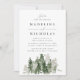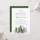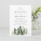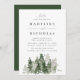 Elegantes invitaciones de boda rústicas mostrando sus nombres y detalles bodas en texto negro con pinos de color verde oscuro cazador y araña de color agua debajo. Las bodas de otoño o invierno ofrecen un hermoso guión moderno de caligrafía. La boda de los bosques invita a revertir a un oscuro fondo verde cazador. Diseñado para coordinar con nuestra colección de bodas Rustic Pine Forest.