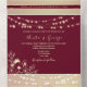 Romántica invitación a una boda todo en uno con un rico fondo burdeos, un rosa de encaje floral dorado y luces de cuerda. Incluye la tarjeta postal RSVP integrada y espacio para su sitio web personalizado. Ideal para bodas rústicas en otoño o invierno con un toque de elegancia y encanto. Por favor, tenga en cuenta que esta invitación "todo en uno" requiere un sobre separado para el envío de correo. Recomendamos emparejarlo con un sobre A9 estándar (5,75" x 8,75") para el mejor ajuste.