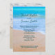 Invitaciones de bodas tropicales en el océano azul con respuesta opcional en la parte inferior. La imagen de agua azul acuática y arena de la playa es el fondo del texto. Los nombres de la novia y del novio están en escritura moderna. Toda la información del fiesta está en forma de párrafo con una plantilla adicional cerca de la parte inferior para obtener información de respuesta. Agregue un sitio web o un correo electrónico o número de teléfono del boda para obtener fácilmente una respuesta de los invitados, o elimine la sección. En la parte trasera de la tarjeta también hay un escenario playero. Elija la versión impresa, con selecciones de actualización en papel, o compre como descarga instantánea para compartirla digitalmente.