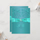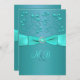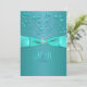 Esta invitación a la boda verde azulada y acuática monogramada tiene una cinta IMPRESIONADA EN cinta y un arco con un broche IMPRESO de piedras preciosas y joyas de diamante que coincide con la tarjeta rsvp que se muestra a continuación.