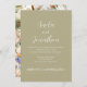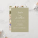 Fijar el tono para una romántica celebración primaveral con esta sabia invitación a la boda floral verde. El frente presenta una tipografía de escritura moderna sobre un suave fondo verde, mientras que la parte trasera muestra un vibrante ramo de flores de jardín florecientes. Personalice los detalles de su boda para crear una hermosa primera impresión para sus huéspedes.