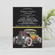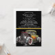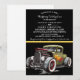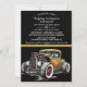 La invitación a la boda del fiesta Hot Rod tiene una llama naranja que se quema alrededor de un auto viejo. En la parte inferior a la parte central y en un fondo negro con un lugar donde poner todo el texto de la invitación. Este diseño único combina una invitación formal a la boda con un vibrante ilustracion de barra caliente. La sección superior muestra detalles para su nombre y la celebración de su nombre boda el "Sábado 18 de enero de 2010" en Vancouver, BC. Debajo, una potente barra caliente de colores brillantes con motor expuesto y tubos de escape avanza, creando un sorprendente contraste de temas. todo personalizable.