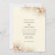 Esta invitación a la boda de boho incluye gráficos de palmeras secas y flores de color rubor sobre un fondo de color crema claro. El reverso de la invitación es un color verde sabio sólido.