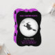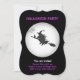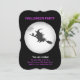 Hermosa bruja voladora de Halloween y la invitación de la fiesta del gato negro. Patrón de gato negro sobre fondo ultravioleta en la parte posterior. Todos los textos y números están listos para ser personalizados.
